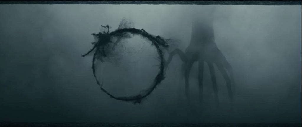 At first, Louise and Ian speak with their alien counterparts in basic words and phrases, the way you would teach language to a toddler. The aliens (affectionately named Abbott and Costello), respond by writing in what’s referred to as “nonlinear orthography”, which is a fancy way of saying “words that look like coffee stains”. All of this is then juxtaposed with news footage of riots and looting. The mere presence of the aliens is a massively destabilizing force, and as the intelligence community refuses to share information with the public at large, news anchors around the globe talk of stock markets collapsing and worldwide communication breaking down.