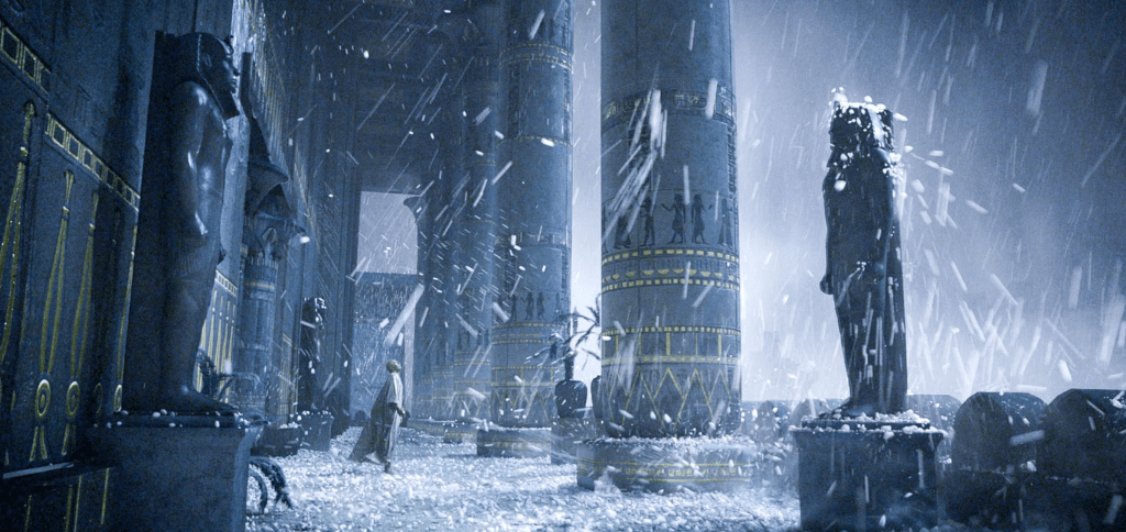 Later, Scott depicts the ten plagues of Egypt as natural phenomena. The Nile runs red after a series of vicious crocodile attacks spill an insane amount of blood. Frogs flee the bloody water en masse; the frogs die, giving way to flies, boils, disease, and so on. And just in case you don’t get the idea, Ewan Bremner shows up as an advisor who explains to Ramses why all of these things are happening. There’s a perfectly rational explanation for everything, right up until a shade of darkness descends upon Egypt and kills every firstborn.