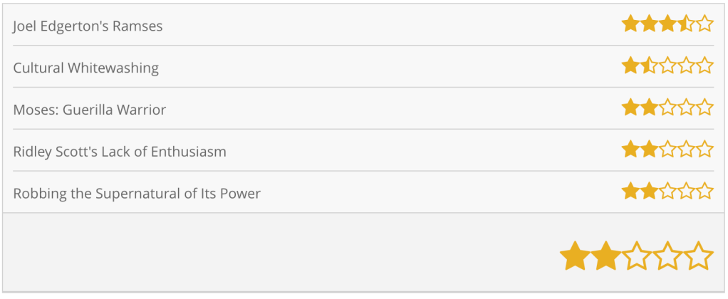 The message is clear: Ridley Scott is less interested in the Exodus story as a religious text than as a piece of historical fiction. That isn’t necessarily a bad impulse, but his insistence on verisimilitude robs the story’s supernatural elements of their power. No amount of slickly-produced fight sequences can save Exodus from its director’s apparent lack of enthusiasm. There are a handful of great moments to be found in this film, but everything surrounding them is impossibly dull, even by the standards of the genre.