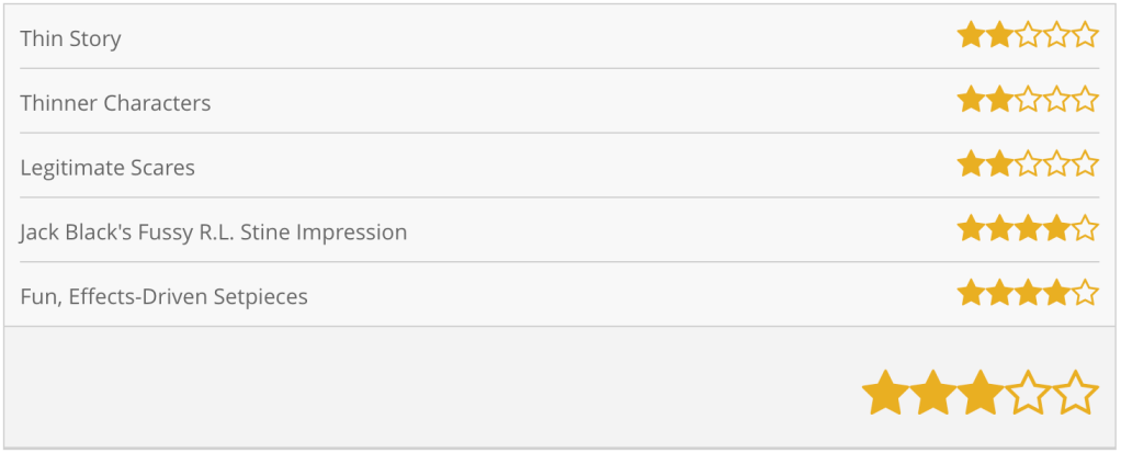 These are touches I appreciate, if only because they show a healthy respect for horror at large. Kids may not know about Freddy or Ash or Steven King now, but in ten years they might. They might then look back on films like this as the primer that sparked their interest in horror. If anything, that’s going to be this film’s legacy. It’s a fun diversion for a late-October evening, but older kids might be ready for something with a few more teeth.