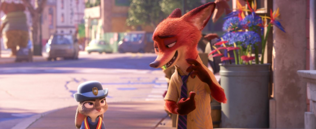 Judy’s dream begins to crumble when she lands a position in the city as a meter maid, until she convinces Chief Bogo (Idris Elba) to give her one of fourteen missing persons cases plaguing the precinct. Enlisting the help of a fox named Nick (Jason Bateman), a local hustler who cons Judy out of twenty bucks her first day on the job, Judy has two days to track down a missing otter. Traversing the city, Judy and Nick run afoul of mob boss Mr. Big (Maurice LaMarche), Mayor Lionheart (J.K. Simmons) and Assistant Mayor Bellwether (Jenny Slate), not to mention the shady organization kidnapping random citizens.