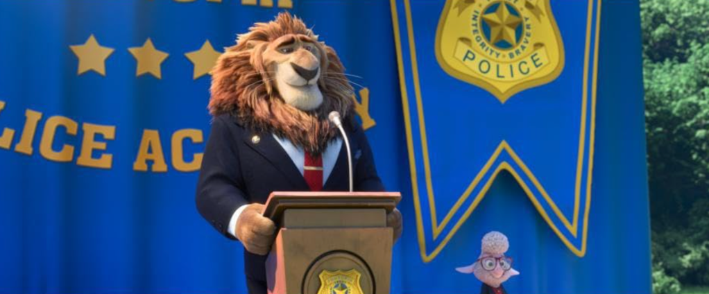 From its very first words (“Fear. Treachery. Blood lust…”), the film’s dialogue is loaded with meaning, explaining to us who these characters represent, and how the film plans to go about it. Predators make up ten-percent of the population in Zootopia, a fact of which citizens like Nick are only too aware. People already distrust Nick because he’s a grifter, and the fact that he’s a fox only adds to the stigma. Or maybe he’s a grifter because he’s a fox; it’s a chicken & egg situation. You can see the analogy they’re drawing here, though. The prejudice associated between predator and prey isn’t where it ends. Early on it’s established that, predator or prey, the little guys often get the short end of the stick in Zootopia. Most of the city’s cops dwarf Judy in size. The precinct features yaks, elephants, and rhinos; mostly creatures that fit the ‘enforcer’ stereotype. In fact, one of the few predators on the force is booking officer Clawhauser (Nate Torrance), a chubby cheetah whose obsession with pop stars and iPhone apps renders him all but harmless. (The precinct considers this a good marketing angle right up until it isn’t.)