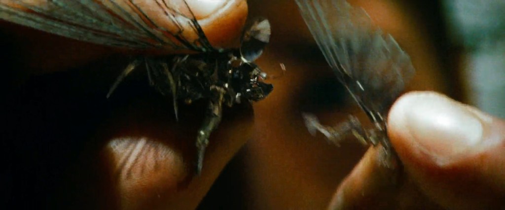 The lack of facial features seems to have been by design, because Revenge of the Fallen is a film obsessed with facial mutilation. Optimus Prime, in particular, has a habit of killing his foes by mangling their faces, either ripping them in half or just cutting them clean off. Recall back to the original, where he cleaves Bonecrusher’s head in two. And for this to be the hero that our human protagonist is supposed to look up to, he is… a bad influence. When Sam catches a buglike robot trying to spy on him, his first move is to grab it’s torso and rip it’s head off. Mikaela captures a little Decepticon named Wheelie, and when he refuses to talk she burns his eye out with a blowtorch! It’s all pretty disturbing, only one-upped during the climactic battle when Prime defeats The Fallen and shouts “GIVE ME YOUR FACE!”. This movie comes from an era where the US’s methods of torture came under intense scrutiny, but it kinda feels like Bay is advocating for it here. But then I also can’t imagine this is something the movie even has on its mind in any serious way. It just really likes burning ants with a magnifying glass.